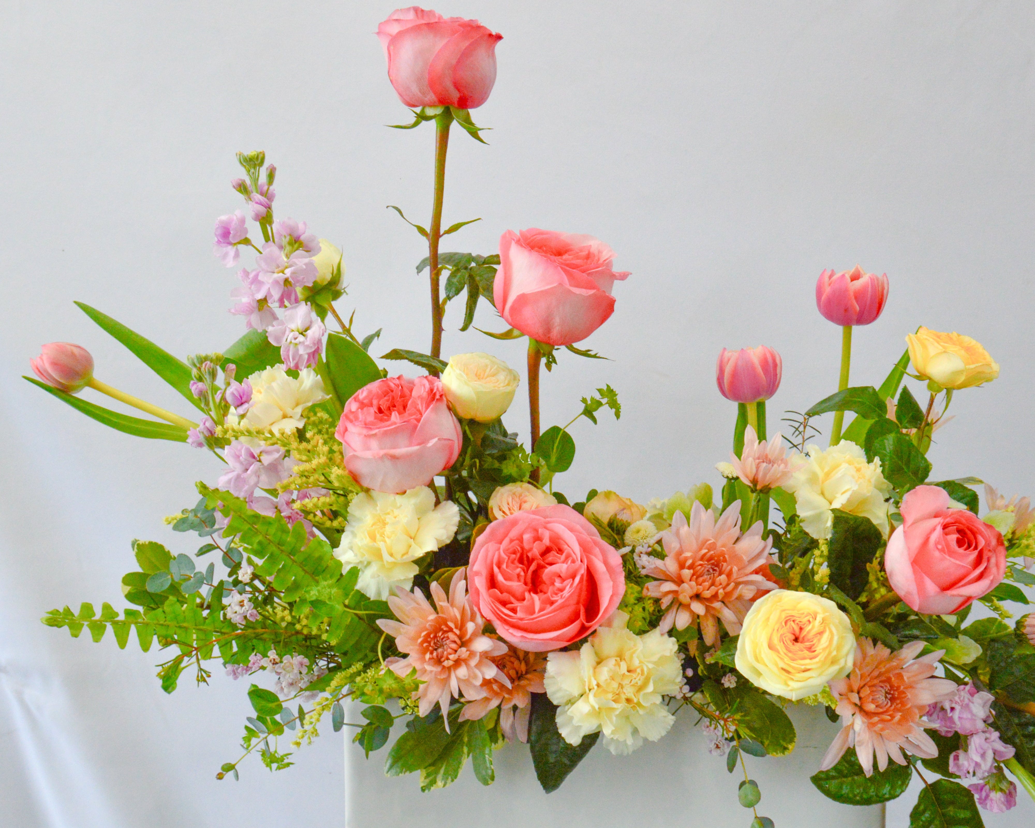 The arrangement will look as close as possible to what you see pictured. However, we do have to make allowances for the whims of nature. Our designers may need to make substitutions based upon what is fresh, seasonal, and available.
